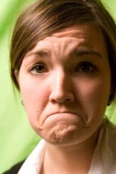 frown - To lower the edges of one's mouth as an expression of displeasure or unhappiness