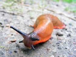 slug - A tough-skinned terrestrial mollusk that typically lacks a shell and secretes a film of mucus for protection. It can be a serious plant pes