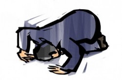 grovel - To lie or move abjectly on the ground with one's face downward